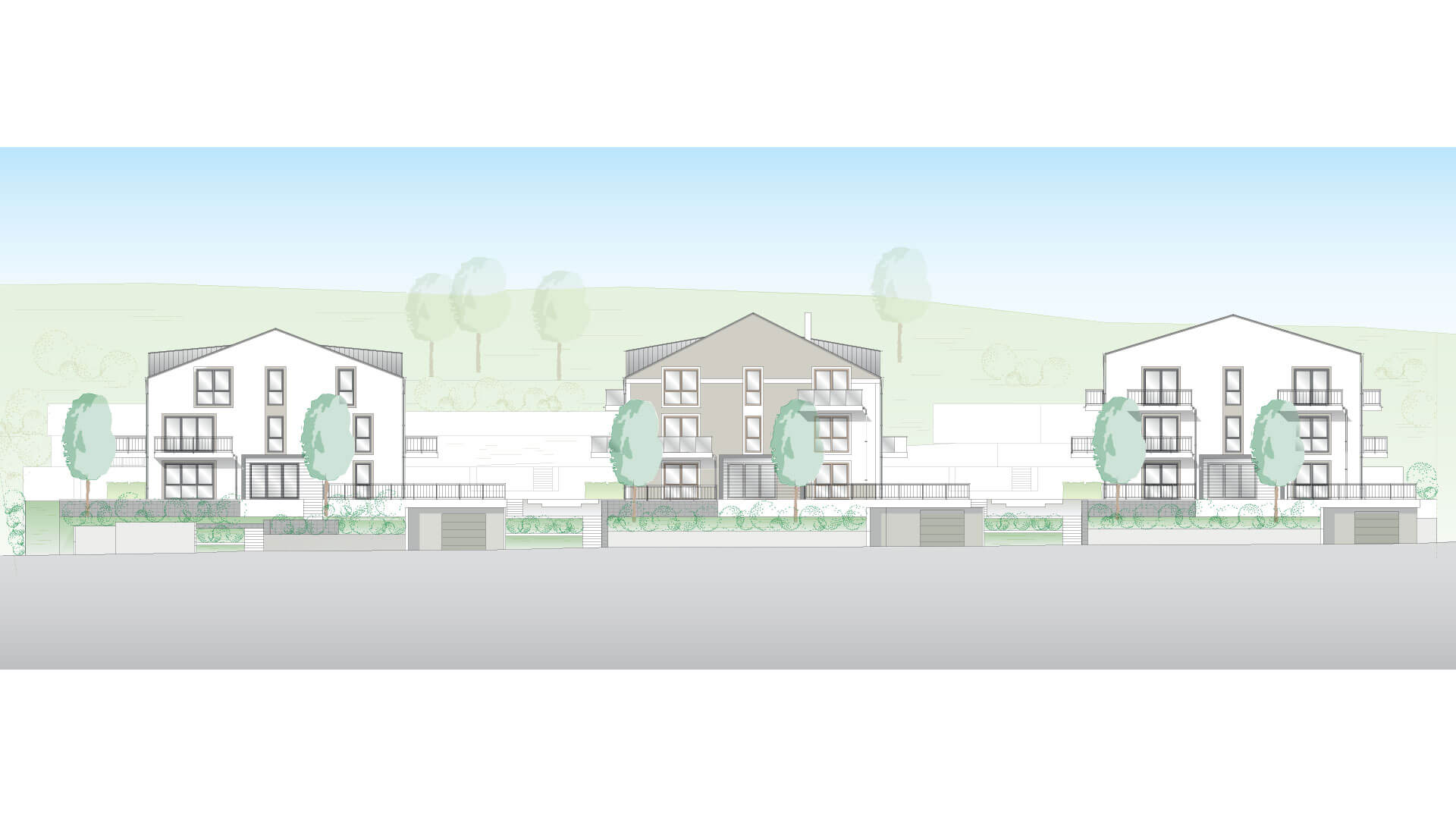 Zum einen gehören die Zuwegungen zu den einzelnen Häusern, sowie die Besucherparkplätze der Eigentümergemeinschaft. Weiter zählt der westliche Hang zum Gemeinschaftseigentum. Der Hang wird als naturnaher Garten angelegt, die Zuwegung ist nur für die Pflege durch den Hausmeisterservice angedacht. Der Weg zum privaten Spielplatz und der Bereich des Spielplatzes selbst kann von den Eigentümern genutzt werden.